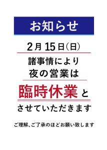 2026/01/05 【1月の休業日のお知らせ】 大変申し訳ございませんが、諸事情により、 1月11日(日)より当面の間、 日曜の夜の営業をお休みさせていただきます。 臨時休業日は、水曜日、日曜の夜となります。 お客様にはご不便をおかけいたしますが、何卒ご理解のほどよろしくお願いいたします。 変更になり次第、ご案内させていただきます。