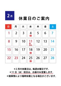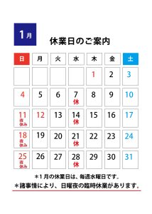 2026/01/05 【1月の休業日のお知らせ】 大変申し訳ございませんが、諸事情により、 1月11日(日)より当面の間、 日曜の夜の営業をお休みさせていただきます。 臨時休業日は、水曜日、日曜の夜となります。 お客様にはご不便をおかけいたしますが、何卒ご理解のほどよろしくお願いいたします。 変更になり次第、ご案内させていただきます。