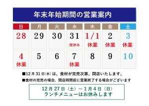 12月27日(土)~1月4日(日)は、ランチメニューをお休みさせていただきます。